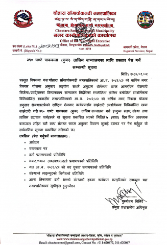 ३९० घण्टे पाककला (कुक) तालिम सञ्चालनका लागि प्रस्ताव पेश गर्ने सम्बन्धी सूचना ।