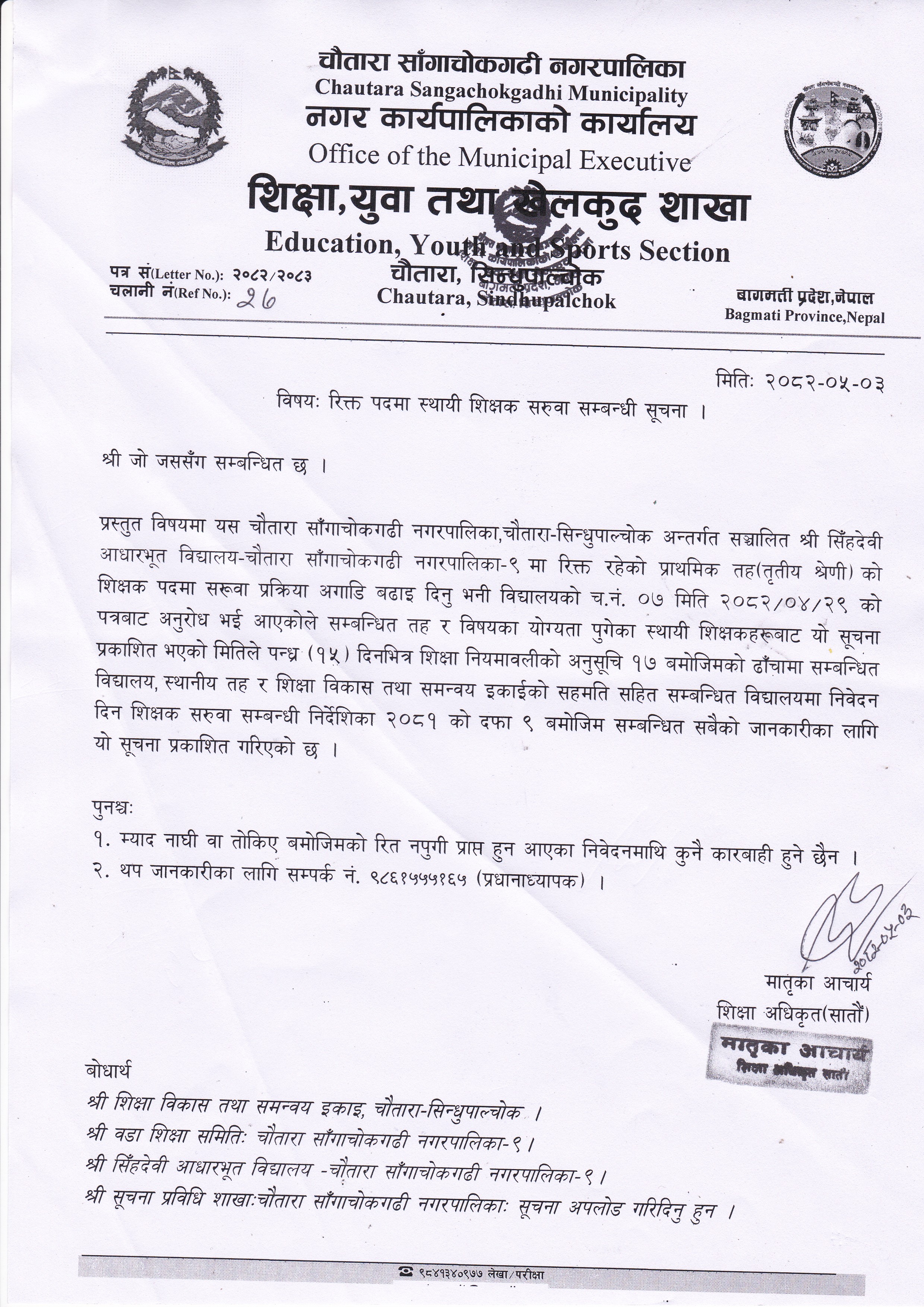 रिक्त पदमा स्थायी शिक्षक सरुवा सम्बन्धी सूचना।